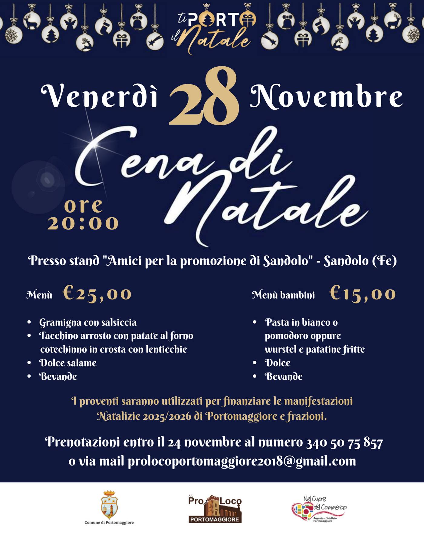 Venerdì 28 novembre, alle ore 20:00, presso lo stand di “Amici per la promozione di Sandolo”, si terrà la tradizionale Cena di Natale.