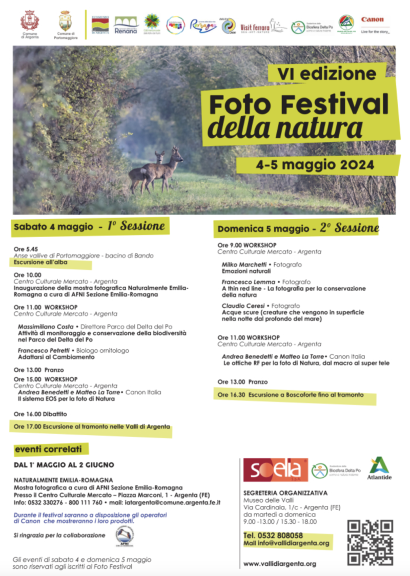 Il 4 e 5 maggio torna il Foto Festival della Natura, giunto alla sesta edizione, organizzato da Comune di Argenta con l’Ecomuseo, in collaborazione con il Comune di Portomaggiore, Parco Regionale del Delta del Po Emilia-Romagna, Soelia S.p.A. e Atlantide Soc. Coop. Sociale p.a..